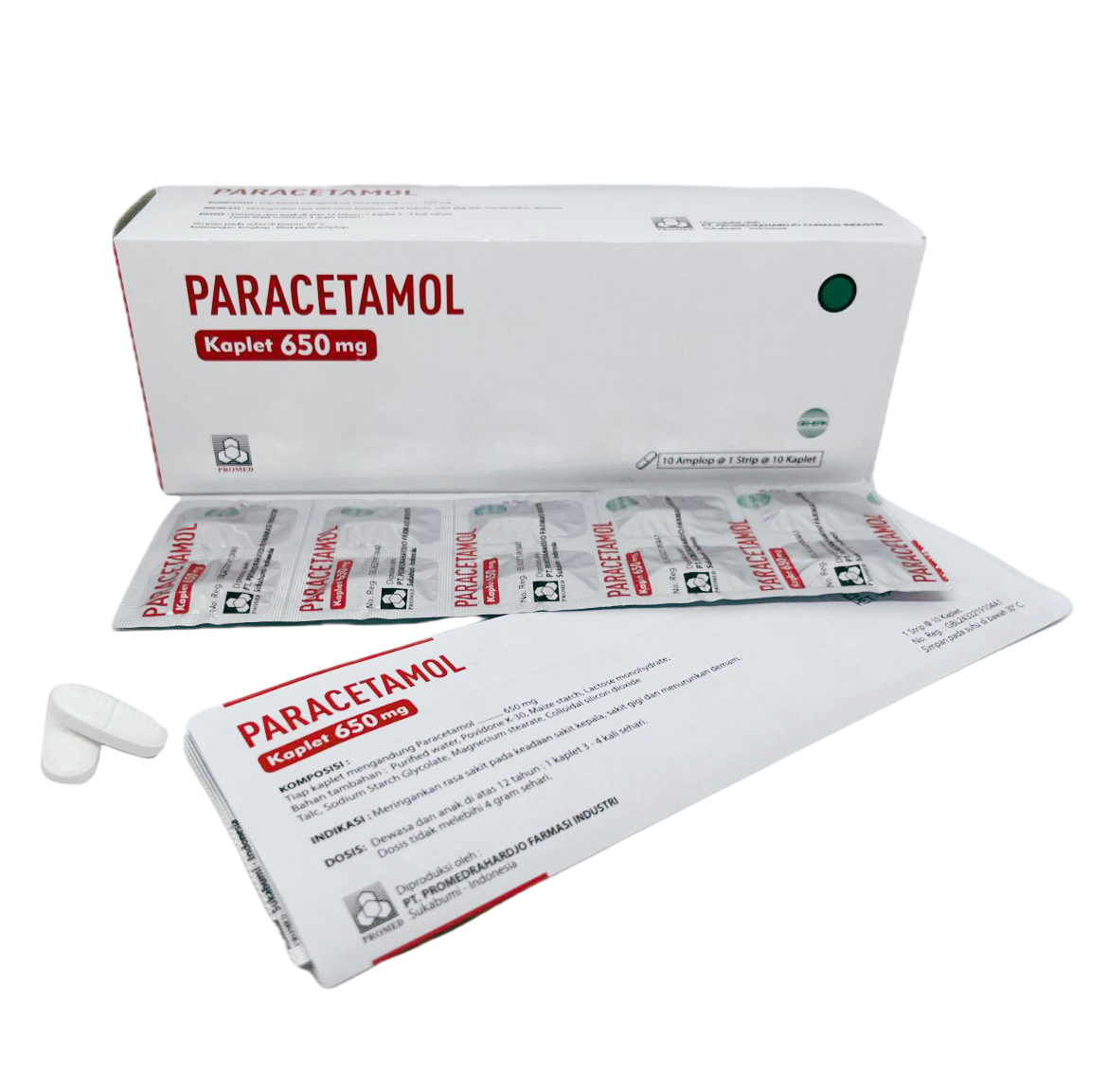 Paracetamol Kaplet. Tiap tablet mengandung Paracetamol 600 mg